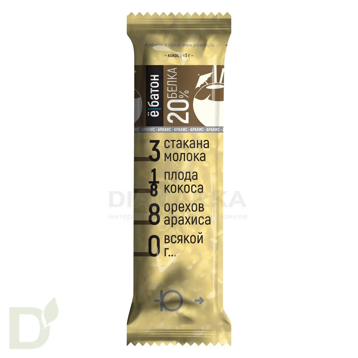 <h2>Протеиновый батончик с цельным орехом в глазури без сахара</h2> Питательность, нереальный вкус и хрустящесть - идеальное комбо для того, чтобы перекусить. Однако производители Ё/батон не забыли и про пользу! Так что же такое орехово-протеиновый батончик Ё/батон?<br> <ul> <li>цельные орехи</li> <li> нежная глазурь</li> <li> повышенное содержание протеина</li> <li> немного клетчатки для ЖКТ</li> <li> правильные жиры из орехов</li> </ul> <h2>Батончик на 20% состоит из белка</h2> Это идеальный продукт для спортсменов, людей с диабетом, сторонников ЗОЖ и ПП!<br> <br> Масса нетто 40г. <br> Срок годности 12 месяцев<br> <h2>Состав батончика Арахис-Кокос</h2> арахис, концентрат молочного белка, концентрат сывороточного белка, сироп цикория, кокосовая стружка, витамины (С, В1, В3, В5, В6, В12), фолиевая кислота, эмульгатор лецитин, соль морская, регулятор кислотности лимонная кислота, глазурь (заменитель какао-масла, эмульгатор лецитин, какао порошок, молоко сухое цельное). Без добавления сахара.<br> <h2>Питательная и энергетическая ценность на 1 батончик</h2> белки 8г<br> насыщенные жиры 12г<br> транс жиры 0г<br> углеводы 17г<br> сахар 0г<br> 212 ккал<br> <br> пищевые волокна 2г (7%*)<br> витамин С 17,7мг (29,5%*)<br> ниацин 4,8мг (26,7%*)<br> витамин В5 1,68мг (28%*)<br> витамин В6 0,72мг (36%*)<br> витамин В1 0,66мг (47%*)<br> фолиевая кислота 54мкг (27%*)<br> биотин 0,03мг (60%*)<br> витамин В12 0,6мг (60%*)<br> <br> *% от среднесуточной потребности
