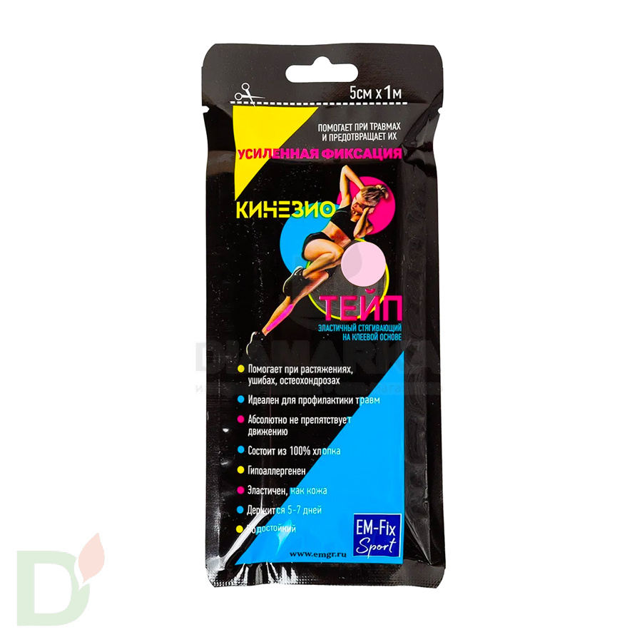 ...а состав клеевой основы имеет гипоаллергенные свойства. Это значит, что кожа под тейпом будет дышать - раздражений и покраснений можно не бояться!Преимущества тейпа EM-Fix Sport усиленной фиксации