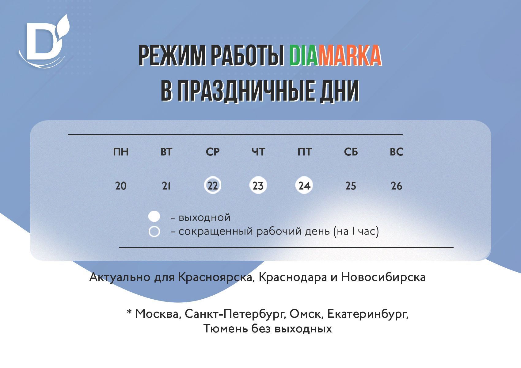 Делимся графиком работы магазинов ДиаМарка в праздничные дни: