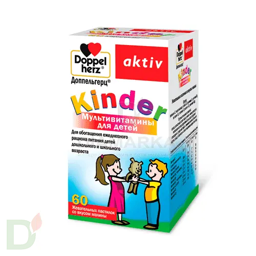 <h3>Ищете мультивитамины  для своего малыша?</h3> <h3>Предлагаем купить жевательные мишки Doppelherz Kinder. Они Вам понравятся!</h3> <h3>Каждый мишка содержит всего 0,15 ХЕ (1,5 углеводов)!</h3> <p> Данные витамины разрешены с 4 лет! Жевательные пастилки со вкусом малины и апельсина! </p> <h2>Основные компоненты мультивитаминов для детей Доппельгерц® Kinder</h2> <ul> <li>витамин С</li> <li>никотинамид</li> <li>витамин Е</li> <li>витамин В6</li> <li>витамин В2</li> <li>витамин В1</li> <li>витамин А</li> <li>витамин D3</li> <li>витаминВ12</li> </ul> <h2>Вспомогательные компоненты мультивитаминов для детей Доппельгерц® Kinder</h2> <ul> <li>сахар, глюкозный сироп, вода, желатин, мальтодекстрин, лимонная кислота, фруктовый концентрат (красная смородина, сахарный сироп, лимонная кислота, бензоат натрия, вода), яблочная кислота, малиновый ароматизатор.</li> <li>Витамин С – является незаменимым фактором питания, так как организм человека не способен синтезировать этот витамин. Обладает антиоксидантными свойствами, повышает показатели иммунитета, улучшает сопротивляемость организма к неблагоприятным факторам внешней среды.</li> <li>Никотинамид – активный участник регуляции обмена веществ. Важен для нормального формирования и функционирования нервной и пищеварительной систем.</li> <li>Витамин Е – обладает выраженными антиоксидантными свойствами, связывает свободные радикалы. Способствует нормальному развитию и функционированию половых желез, ускоряет регенерацию поврежденных клеток.</li> <li>Витамин В6 – участвует во многих биохимических реакциях, необходимых для поддержания жизненно важных процессов человеческого организма. Улучшает функциональную деятельность центральной нервной системы.</li> <li>Витамин В2 – важен для клеточного дыхания, способствует усвоению кислорода. Необходим для синтеза гемоглобина. Входит в состав зрительного пурпура, улучшает темновую адаптацию.</li> <li>Витамин В1 – улучшает функции нервной системы, необходим для обмена веществ в нервных тканях, повышает аппетит.</li> <li>Витамин А – является активным антиоксидантом, играет роль в формировании иммунной системы ребенка, повышает сопротивляемость организма к различным инфекциям. Улучшает цветовое восприятие, важен для обеспечения нормальной зрительной функции.</li> <li>Витамин D3 – участвует в регуляции минерального обмена, поддерживает кальциевый и фосфорный гомеостаз, необходим для нормального формирования и роста костей и зубов.</li> <li>Витамин В12 – поддерживает нормальное функционирование нервной системы, необходим для образования гемоглобина.</li> </ul> <p> <br>     Рекомендации по применению:  <br>      Детям старше 4 лет по 1 пастилке в день во время еды с пищей, детям старше 11 лет по 1 пастилке 2 раза в день.<br>      Продолжительность приема 1 месяц. После перерыва в 1 месяц прием можно повторить. </p>